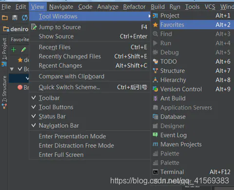 书签不是默认视图,所以我们要把它添加到当前视图中:View -> Tool Windows -> Favorites,打开 Favorites 面板: